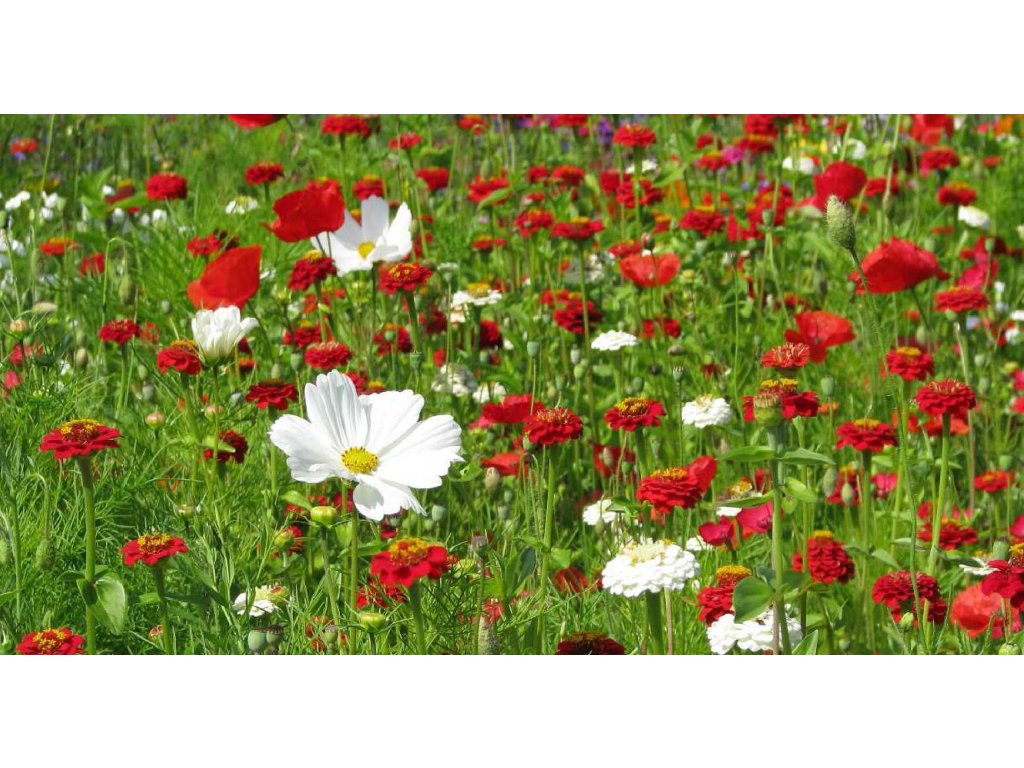Na této louce vykvete nejprve bílá lokanka, penízek a letničkový šater, který dodá vzhledu lehkost a pohyb. O něco později se rozvine základní květ tohoto jahodovo-vanilkového koberce: šarlatová ostálka liliput s malými plnými květy, které zaručují dlouhé kvetení. K červené vlně se přidá červený mák a krásenka Royal. Slézovec tříměsíční Mont Blanc hned na to posílí bílou, zatímco