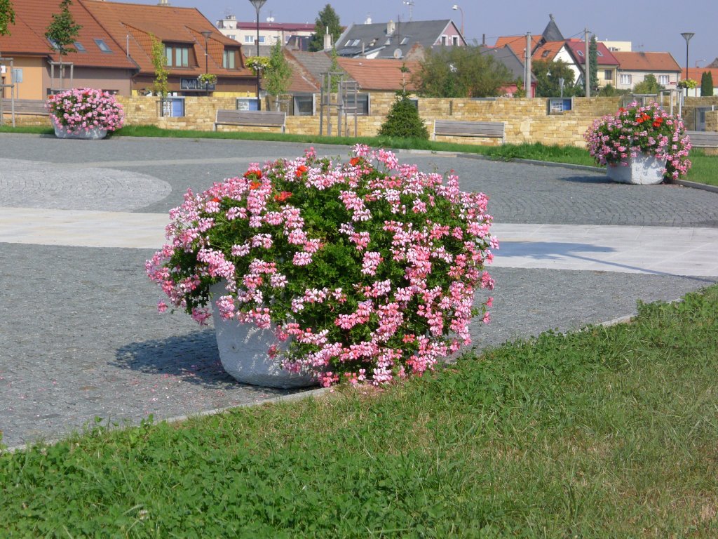 balkonové truhlíky, závěsné květináče, květinové záhony, zeleninové záhony, výsadba stromů a keřů, trávníky.